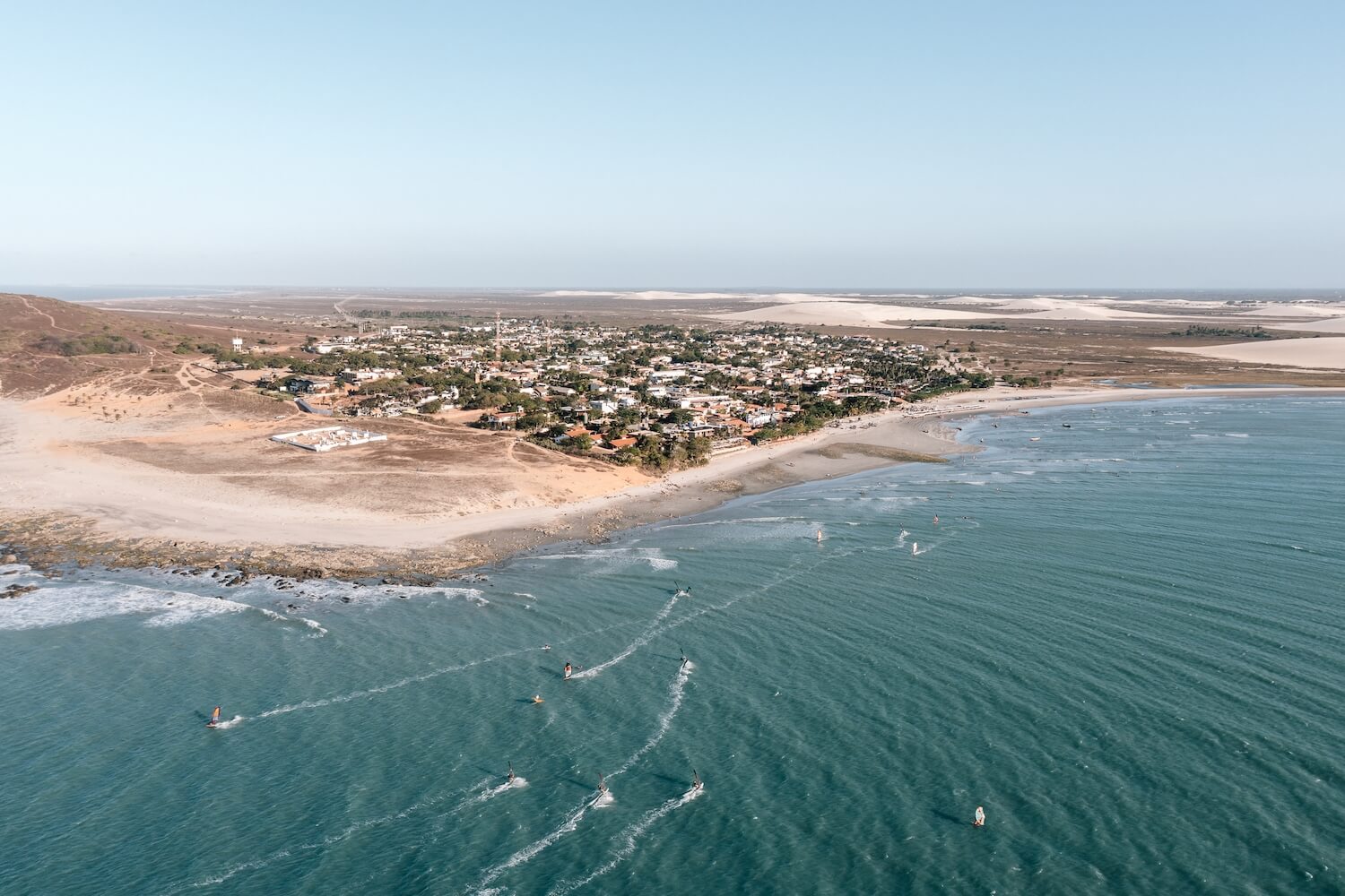 Je weiter wir nach Norden kommen, desto stärker wird der Wind – rund um Jericoacoara erreicht er häufig 30 Knoten und mehr. Die Küstenlinie öffnet sich, wodurch längere und dynamischere Downwind-Strecken möglich werden. Wir fahren ausgedehnte Downwinder Richtung Preá und Guriú und arbeiten gezielt daran, Swell-Linien zu verbinden, den Ozean richtig zu lesen und über längere Distanzen Geschwindigkeit sowie Effizienz zu halten.